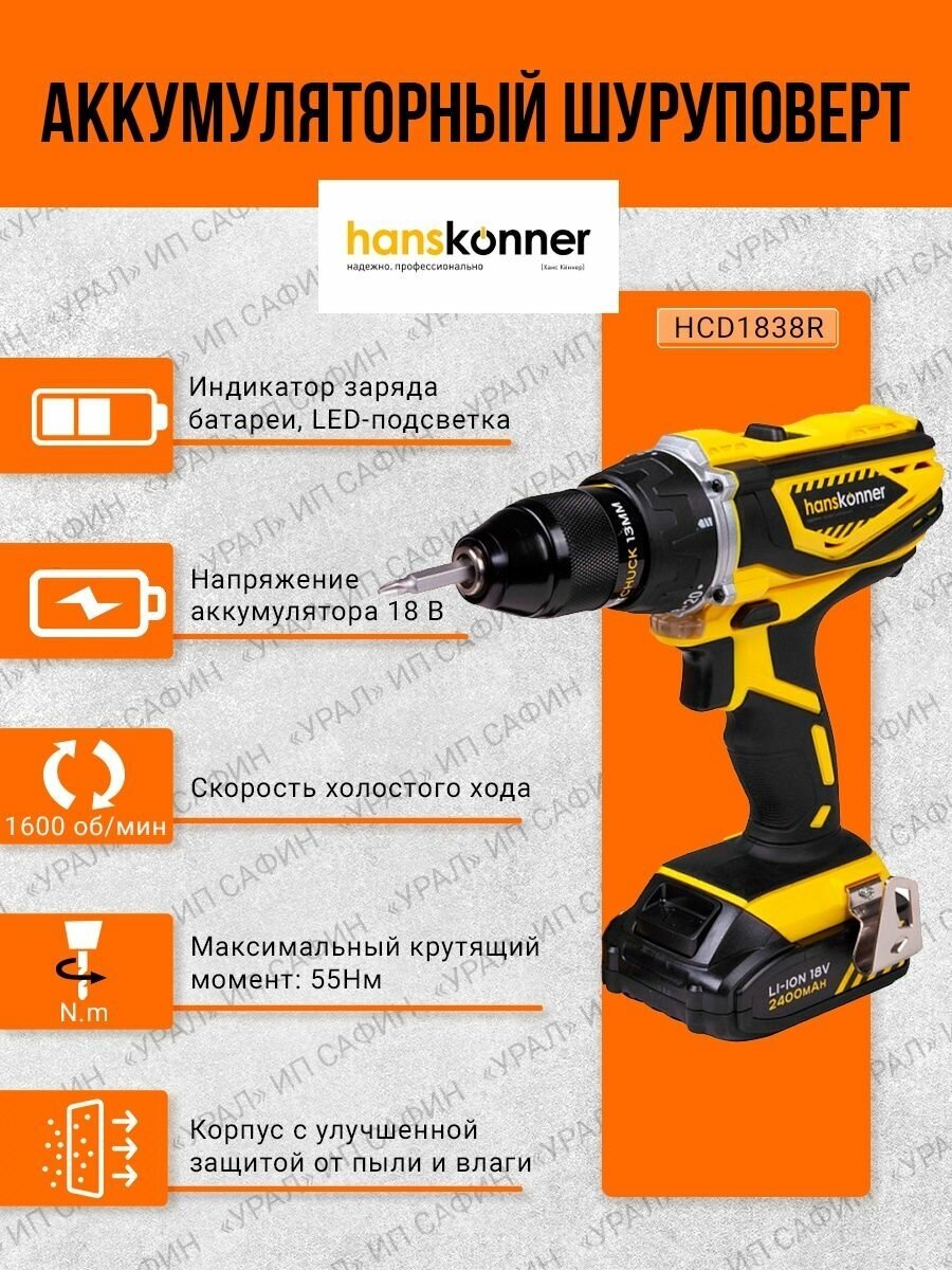 дрель аккум hanskonner hcd1838 r 18в lilon 2ск 2акк 24ач 55нм 13мм 74975 ean:4603010082439