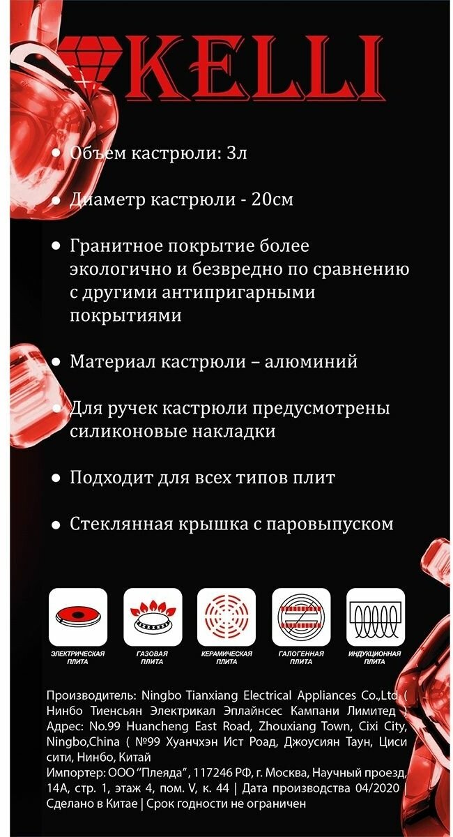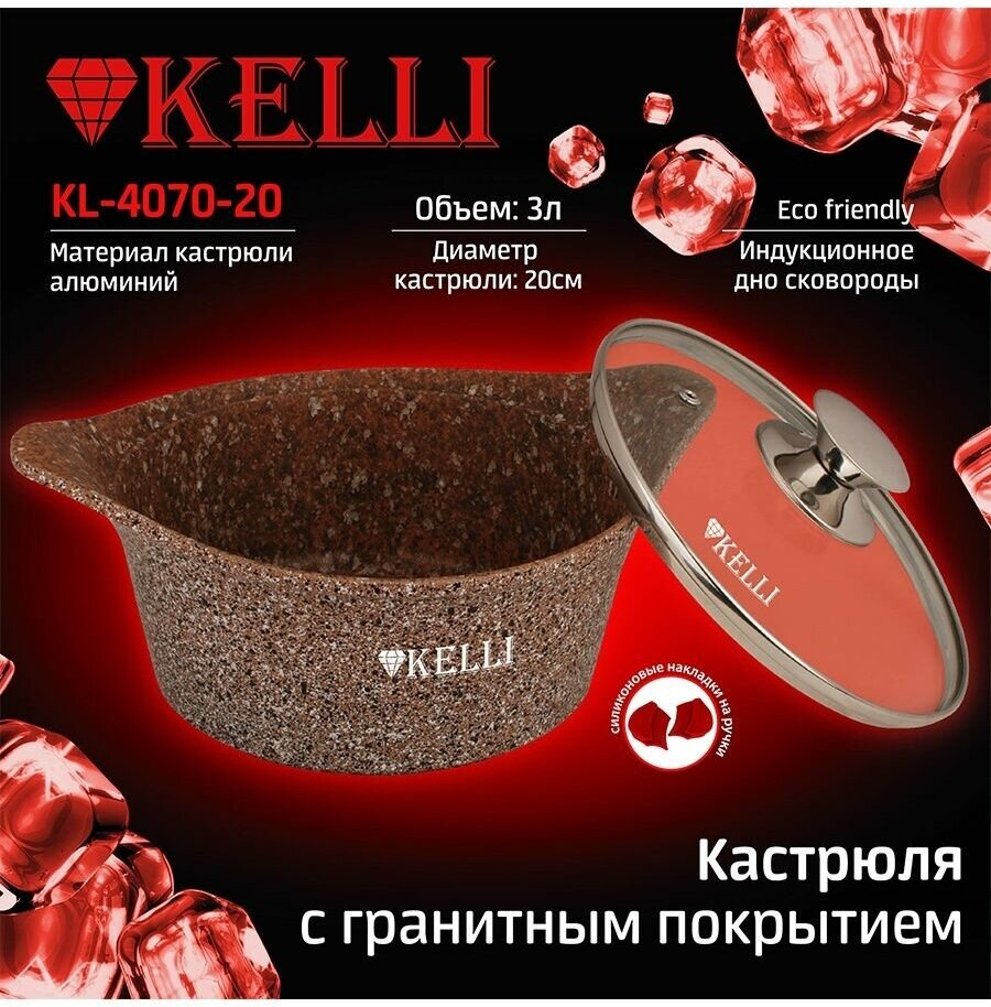 Лучшие цены. Кастрюля Kelli KL-4070-20 диаметром 20 см, объемом 3,5 литра - изготовлена из высококачественного алюминия по технологии Eco Friendly, экологически чистого, долговечного материала, который чрезвычайно устойчив к коррозии и надолго сохраняет свои функциональные свойства. Антипригарное гранитное покрытие. Многослойное дно. Ручки с силиконовыми накладками. Жаропрочная стеклянная крышка с паровыпуском. Подходит для всех видов плит. Подходит для мытья в посудомоечной машине. Магазины в вашем городе.