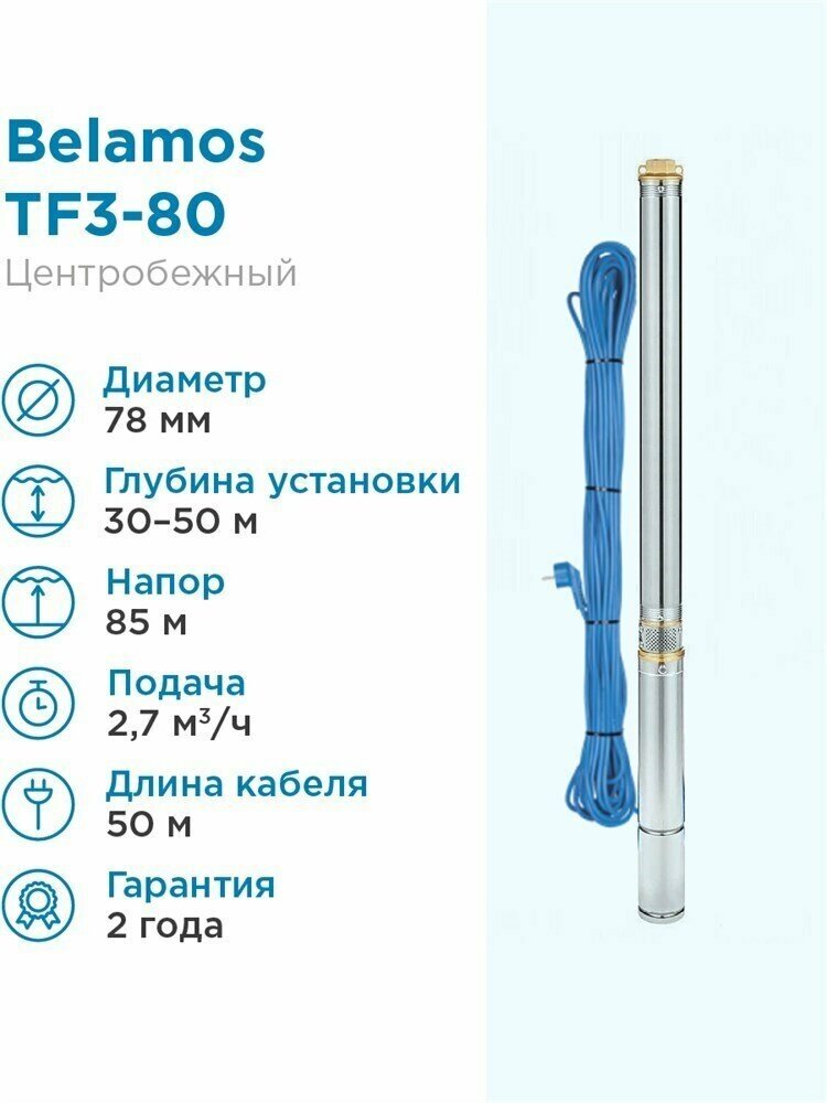 Насос скважинный центробежный Belamos TF3-80, 45 л/мин, Н-85 м, Ø-3", каб.50 м