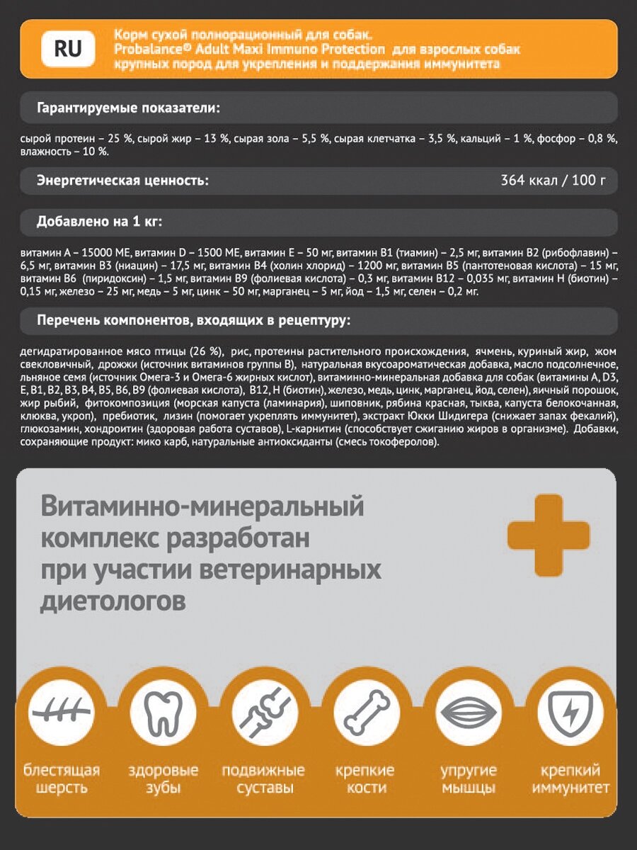 Probalance Сухой корм для взрослых собак крупных пород, укрепление и поддержание иммунитета