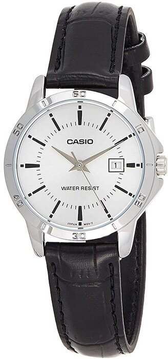 Лучшие цены. Центральная секундная стрелка. Точный кварцевый механизм Женские наручные часы Casio LTP-V004L-7A кварцевые, элементом питания которых является батарейка. Корпус стальной с черным и серебристым циферблатом и минеральным стеклом, которое не расколется от легкого удара, браслет - кожаный ремешок. Модель Casio LTP-V004L-7A обладает степенью влагостойкости 50 м (5 АТМ), в этом случае разрешено кратковременное погружение в воду, для плавания рассмотрите модели от 100 м (10 АТМ). Магазины в вашем городе.