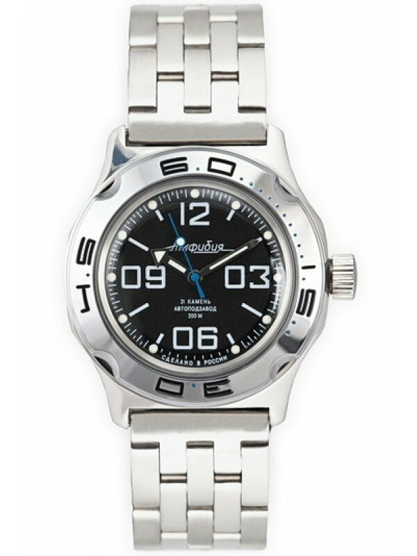Лучшие цены. Мужские российские механические наручные часы Восток Амфибия 100819 с автоподзаводом. Оригинальный дизайн циферблата. Пружинный механизм с точностью +60/- 20 сек в сутки. Механизм калибра 24 мм с центральной секундной стрелкой. В механизме рубиновых камней - 31. Запас хода до 33 часов. Частота 19800 полуколебаний в час. Стрелки часов покрыты безопасным люминесцентным покрытием, которое светится в темноте. Противоударное устройство оси баланса от небольших механических воздействий. Магазины в вашем городе.