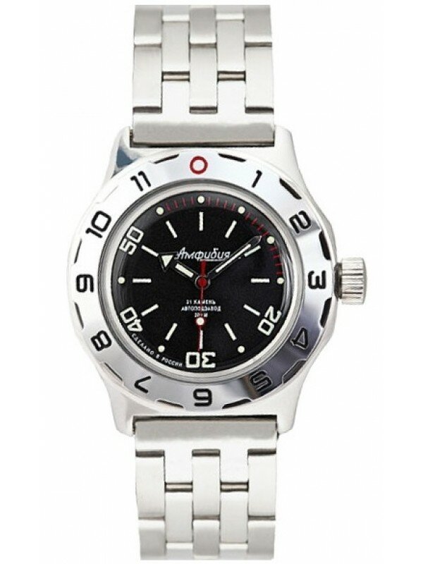 Лучшие цены. Мужские российские механические наручные часы Восток Амфибия 100820 с автоподзаводом. Оригинальный дизайн циферблата. Пружинный механизм с точностью +60/- 20 сек в сутки. Механизм калибра 24 мм с центральной секундной стрелкой. В механизме рубиновых камней - 31. Запас хода до 33 часов. Частота 19800 полуколебаний в час. Стрелки часов покрыты безопасным люминесцентным покрытием, которое светится в темноте. Противоударное устройство оси баланса от небольших механических воздействий. Магазины в вашем городе.