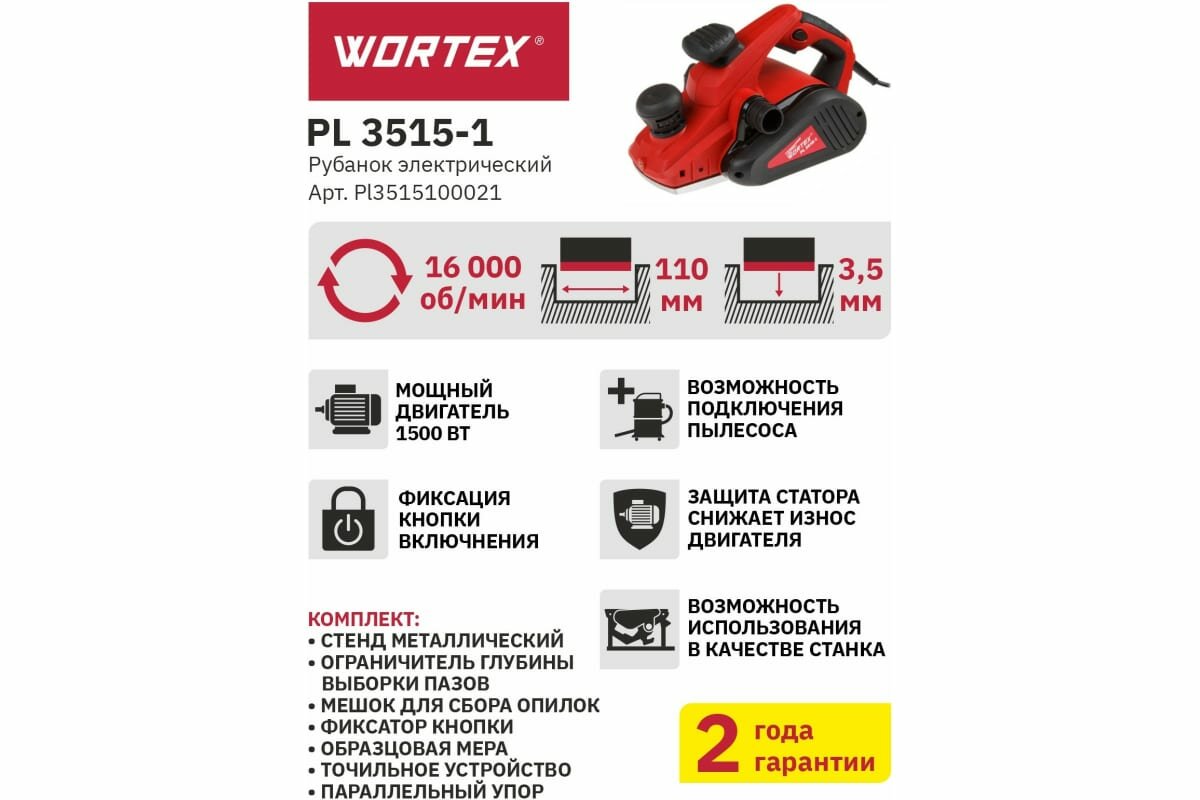 Рубанок электрический Wortex PL 3515-1, в коробке, аксессуары в комплекте, 1500 Вт, ширина до 110 мм, глубина до 3.5 мм (PL3515100021)