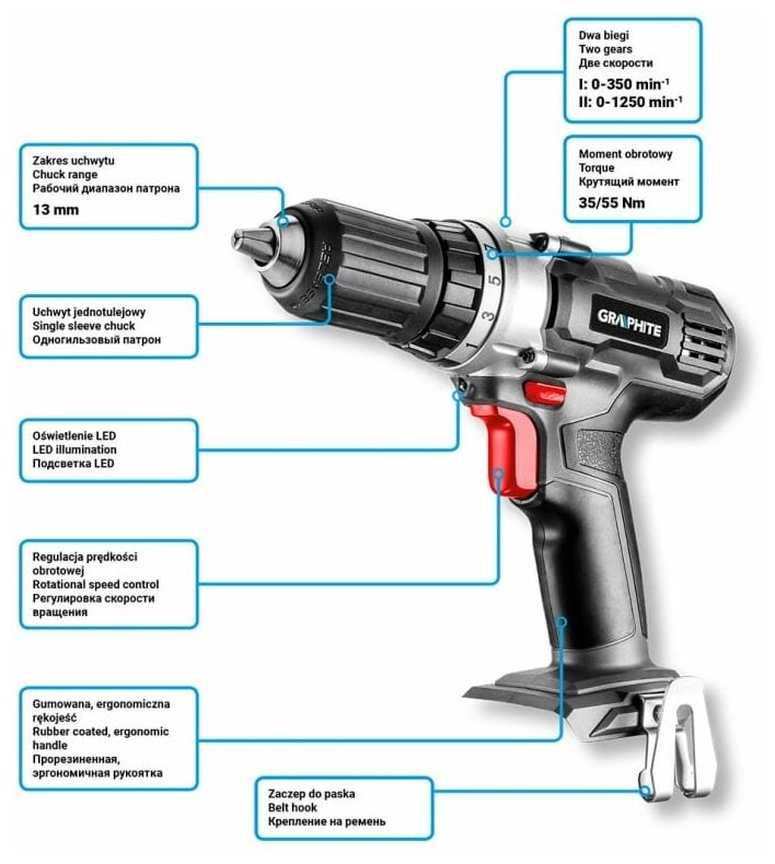 GRAPHITE Дрель-шуруповерт аккум Energy + 18V Li-Ion, самозажимной патрон 13 мм,/без АКБ и ЗУ/ 58G006
