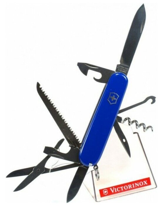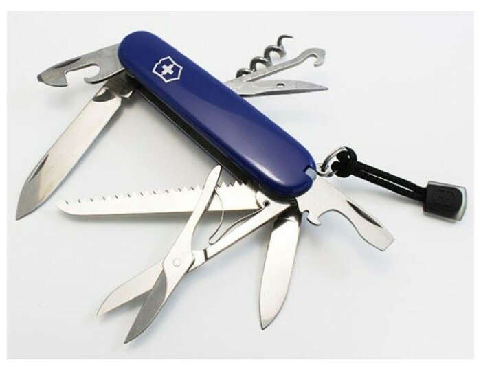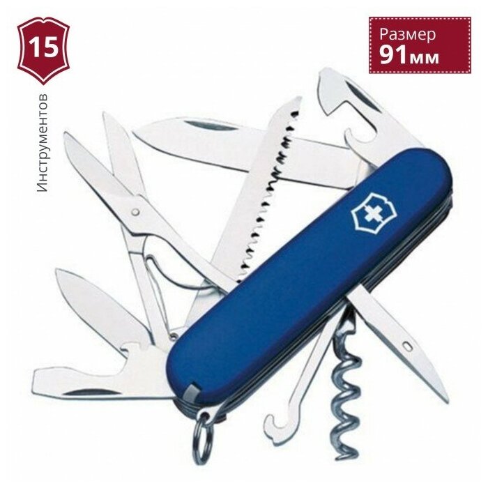 Лучшие цены. Нож перочинный VICTORINOX Huntsman, 91 мм, 15 функций, лезвие и инструменты из нержавеющей стали, рукоять из синего пластика. Швейцарский армейский нож HUNTSMAN имеет 15 функций: Большое лезвие Малое лезвие Штопор Консервный нож Малая отвёртка Открывалка для бутылок Отвёртка Инструмент для снятия изоляции Шило, кернер Кольцо для ключей Пинцет Зубочистка Ножницы Многофункциональный крючок Пила по дереву Цвет рукояти: синий Рекомендуемые чехлы: 4.0480.1, 4.0480.3, 4.0520.1, 4.0520.3, 4.0520.31, 4.0520.32, 4. Магазины в вашем городе.