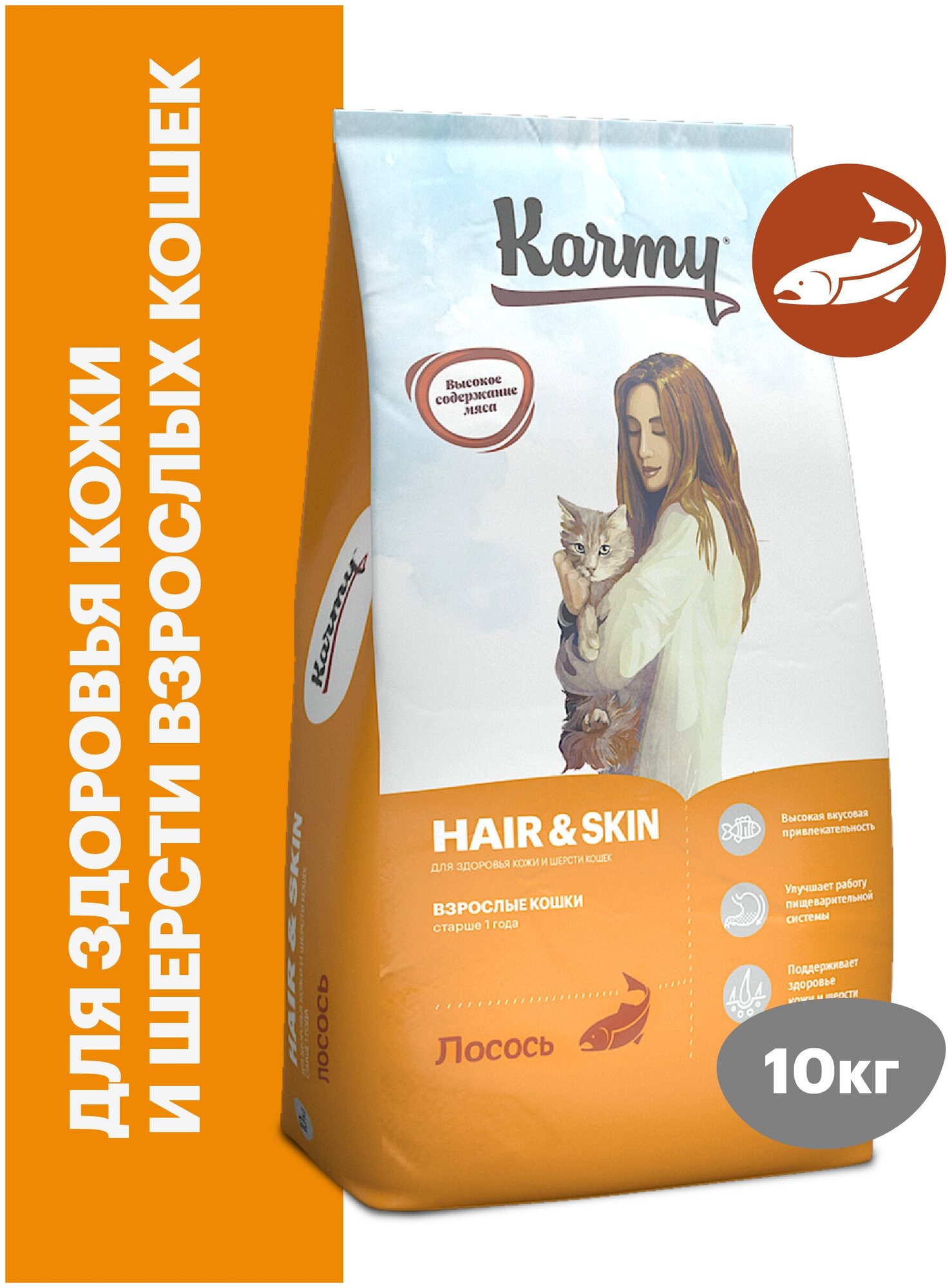Корм для кошек Корм Karmy Hair & Skin для кошек, поддерживающий здоровье кожи и шерсти, с лососем, 10 кг