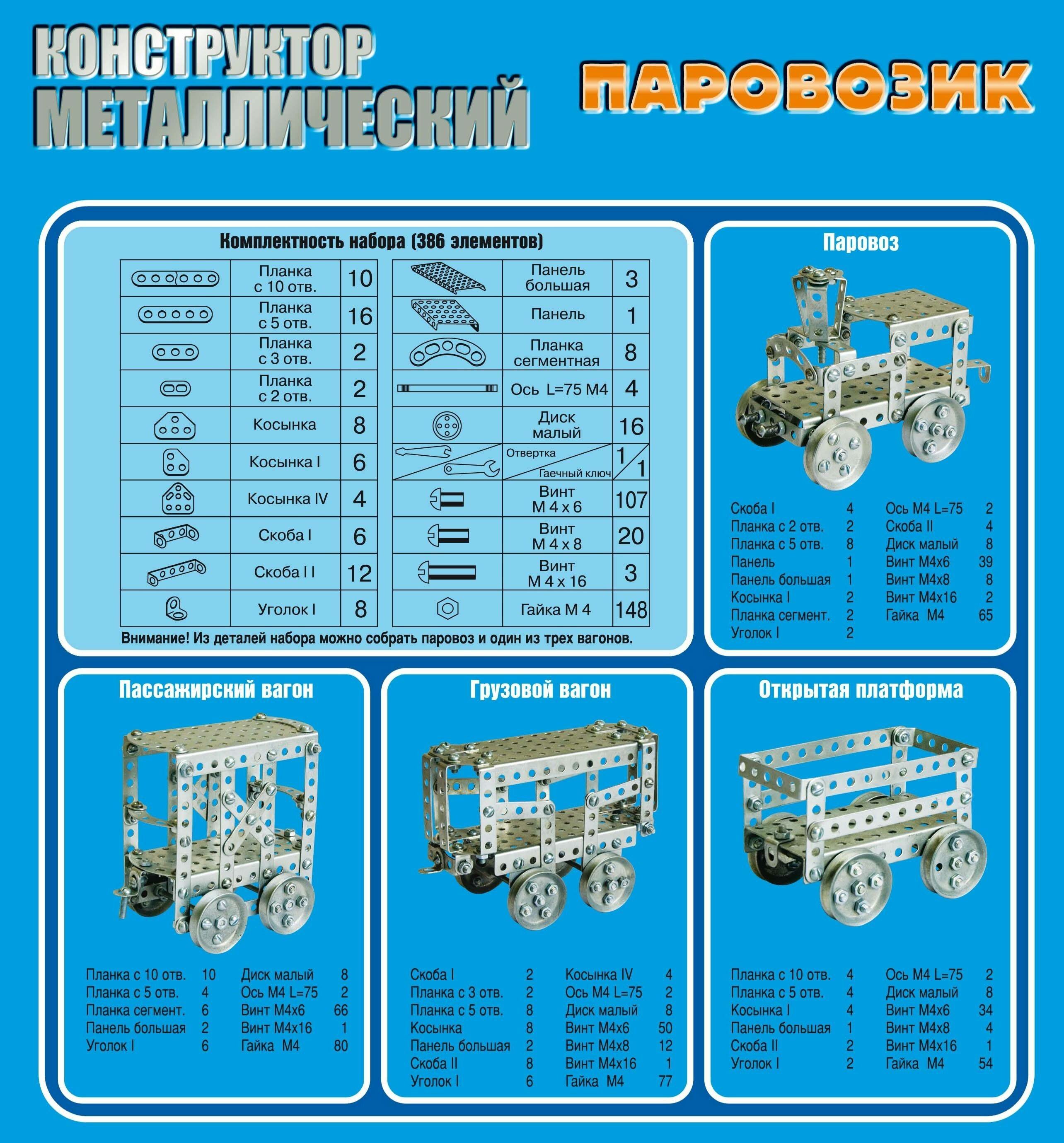 Лучшие цены. Конструктор металлический «Паровозик» предназначен для детей от 7 лет. Внутри яркой упаковки находится набор из 386 деталей, включая гайки, винты, ключи и прочее. Собрав все части воедино, у ребенка получится паровоз и один из трех возможных вагонов (пассажирский, грузовой, платформа). Кроме того, из тех же деталей юный техник может создать абсолютно любую фигуру или вид транспорта. Для этого достаточно лишь следовать за воображением. Магазины в вашем городе.