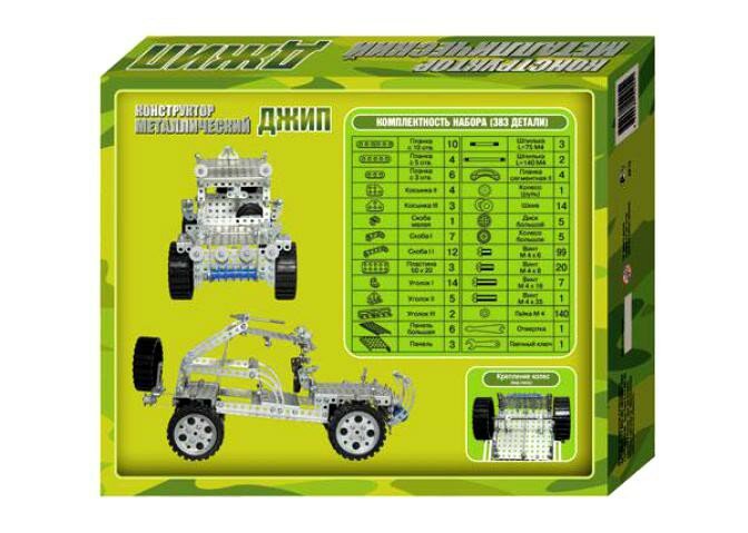 Лучшие цены. Конструктор металлический "Джип" . В набор входит 26 видов деталей, а также отвертка и гаечный ключ. На коробке приводятся фотографии модели и список необходимых для ее изготовления деталей.Теперь мальчик сможет почувствовать себя конструктором настоящего Джипа! Получив определенный видимый результат ребенок получит удовлетворение от приложенных для этого усилий. Таким образом у него сложится четкое представление о том, что для того что бы получить нужно приложить усилия. Магазины в вашем городе.