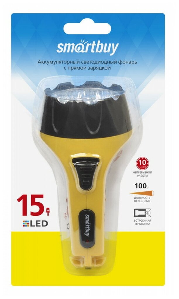Фонарь ручной SmartBuy аккумуляторный, светодиодный, 15 LED, прямая зарядка от сети, желтый SBF-85-Y