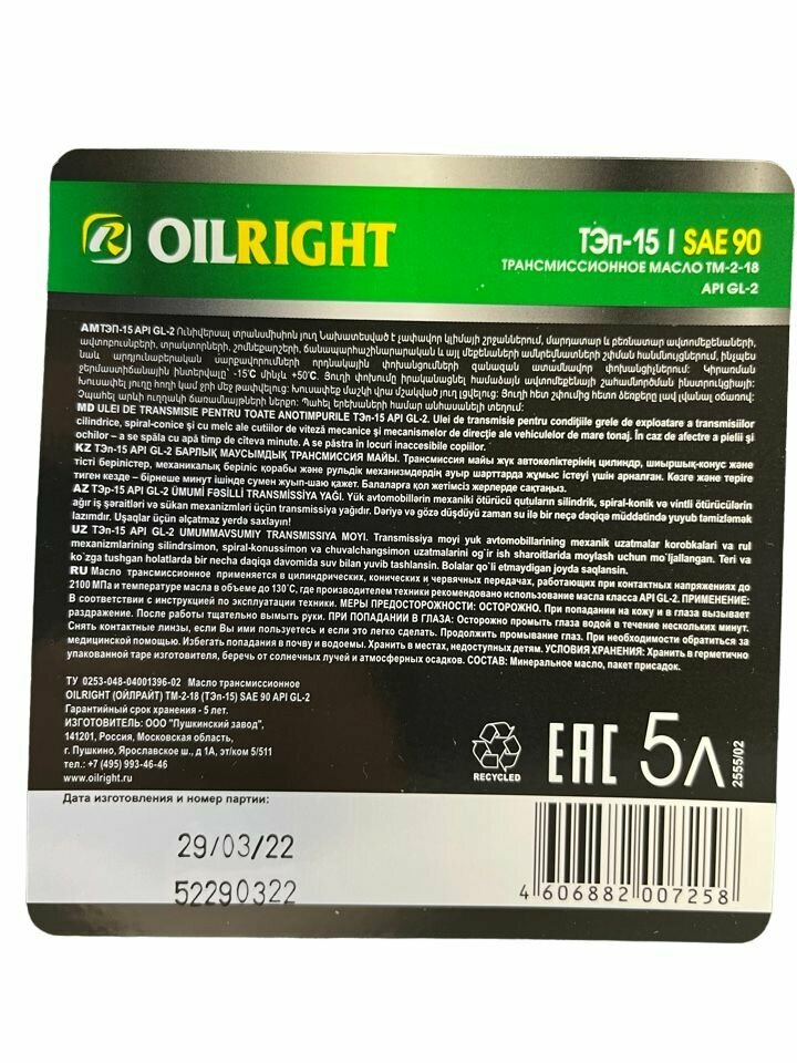 OIL RIGHT 2552 Масло OILRIGHT Тэп-15 SAE90 нигрол GL-2 10л мин 2 000 ₽ Подробнее