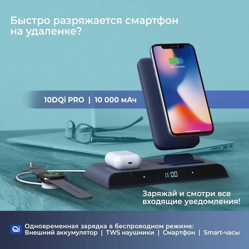 Внешний аккумулятор 10000мАч PB10DQi PRO + док-станция и двойная беспроводная зарядка для iPhone айфон/samsung самсунг /Xiaomi ксяоми / Huawei хуавей