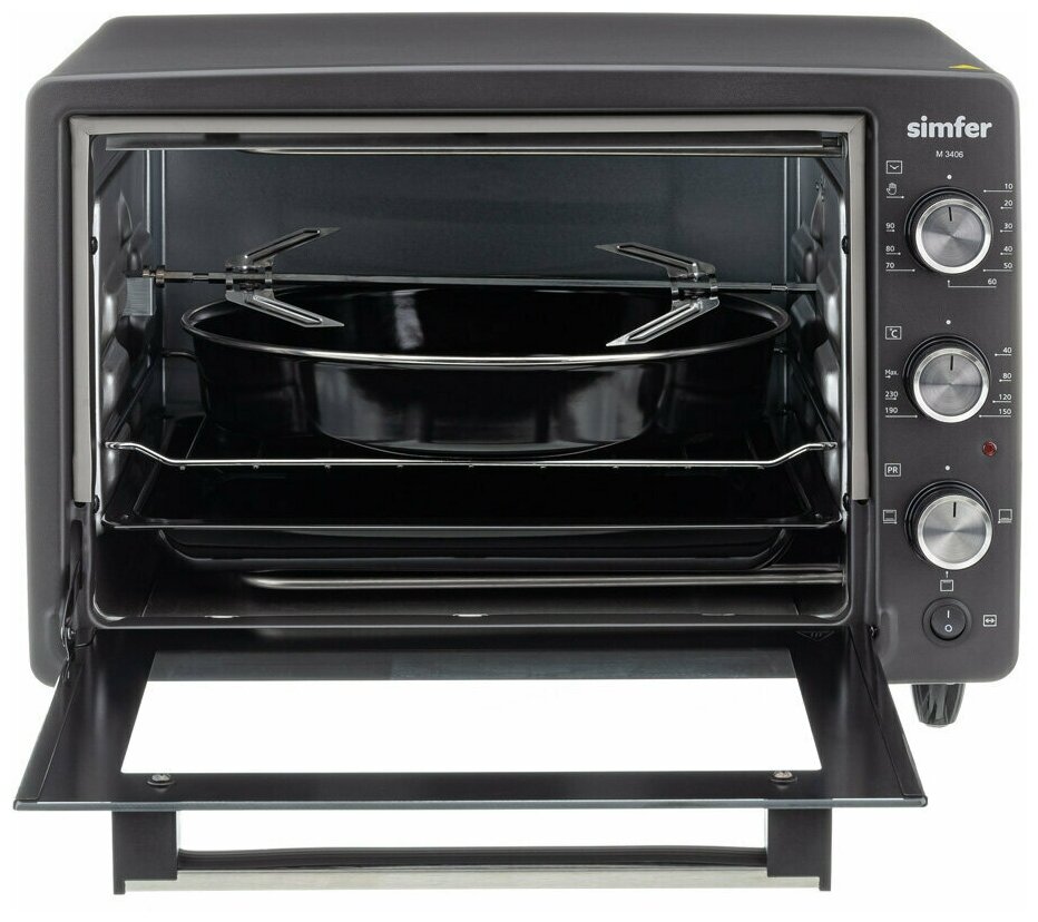 Лучшие цены. Электрическая мини-печь Simfer M3406 выпускается в качестве ростера. Этим термином обозначают универсальные и компактные бытовые устройства, которые предназначены для приготовления или разогрева самых разных блюд – мясных, рыбных, выпечки и т. д. Чтобы реализовать настолько широкий функционал на практике известный турецкий производитель предусмотрел четыре разных режима работы мини-печи, включая: Верхний нагрев; Нижний нагрев; Сочетание верхнего и нижнего нагрева; Вертел. Магазины в вашем городе.