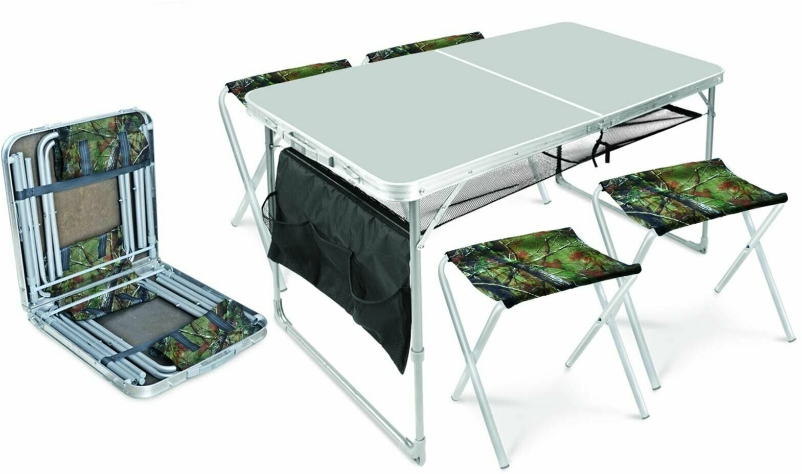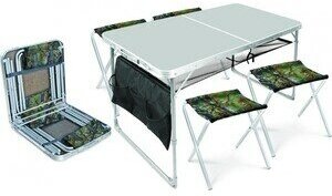 Лучшие цены. Раскладной алюминиевый стол с пластиковой столешницей и стульями — необходимый аксессуар для пикника или похода. Комплект мебели можно взять с собой на рыбалку, охоту, привезти на дачу или поставить в саду загородного дома. Набор складной садовой мебели занимает мало места, мало весит, хранится в маленьком чемоданчике, который быстро трансформируется в полноценный обеденный гарнитур. Магазины в вашем городе.