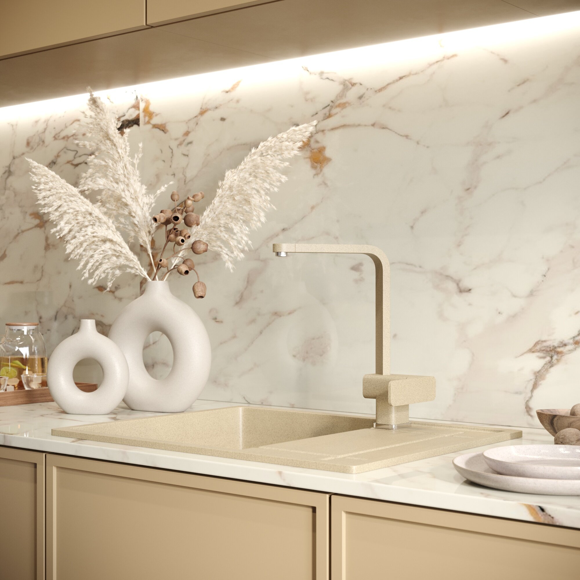 Кухонная мойка Мойка кухонная Domaci Солерно EMQ-1650.Q сардоникс, бежевая, 65х50 см, кварцевая, прямоугольная, с крылом, бежевая