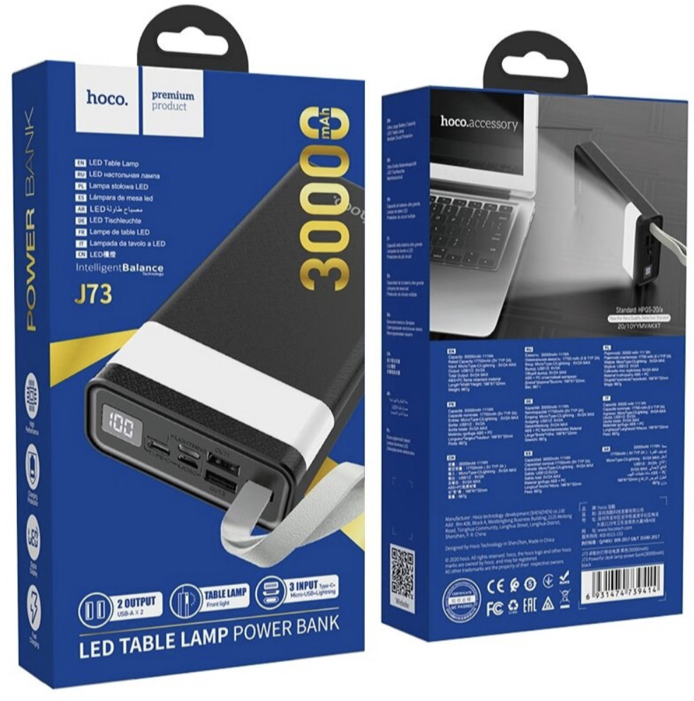 Лучшие цены. Внешний АКБ HOCO J73 Powerful 30000mAh, 2хUSB, 2A, LED дисплей, фонарик, Li-Pol (черный) Характеристики: 1. Емкость: 30000mAh 111Wh. Номинальная емкость: 17700mAh. 2. Вход: Micro-USB / Type-C / Lightning: 5V / 2A. 3. Выход: общий выход 5V / 2A, выход одного порта 5V / 2A. 4. Дисплей: LED цифровой дисплей уровня заряда. 5. Материал: ABS + огнеупорный PC + литий-полимерный аккумулятор. 6. Размер: 166*81*32мм. Вес: 667г. 7. С ремешком для переноски, два выхода, три входа, с лампой. Магазины в вашем городе.