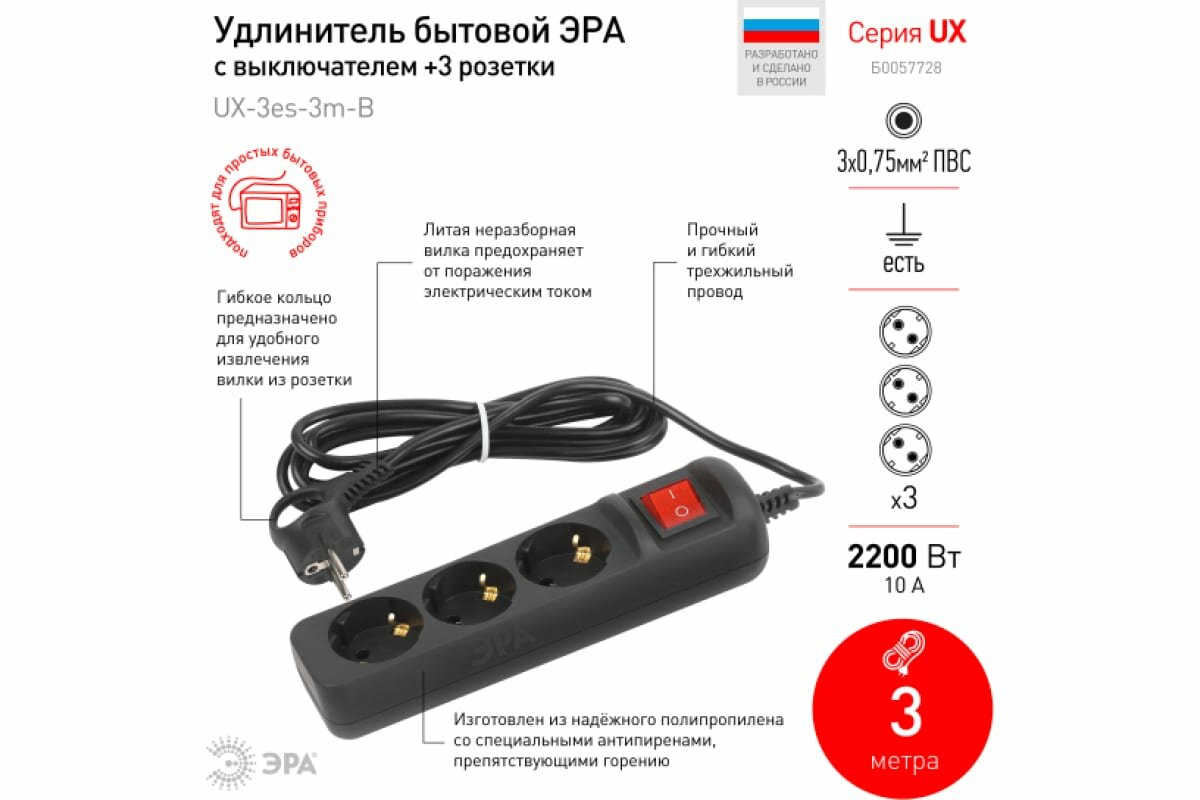 Удлинитель ЭРА UX-3es-3m, 3 розетки, с/з, 10А / 2200 Вт черный 3 м