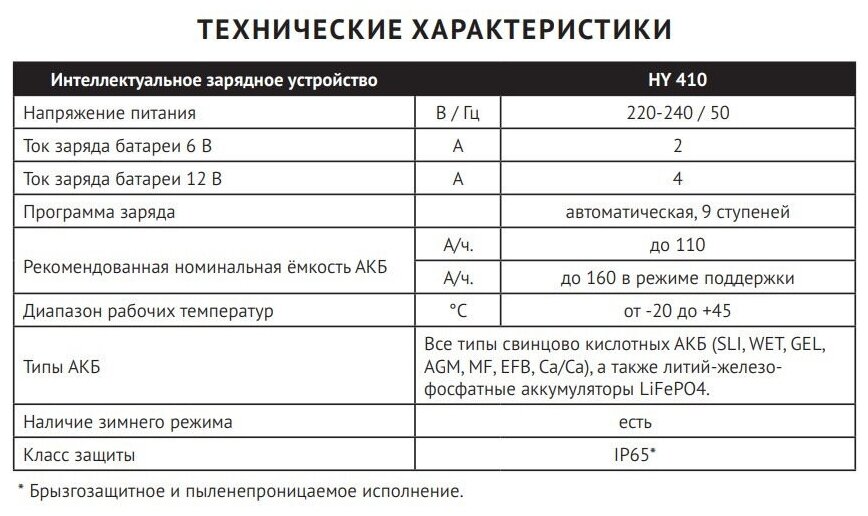 | Совместимость с аккумуляторами (АКБ) | WET/EFB (Lead-Acid) / GEL |