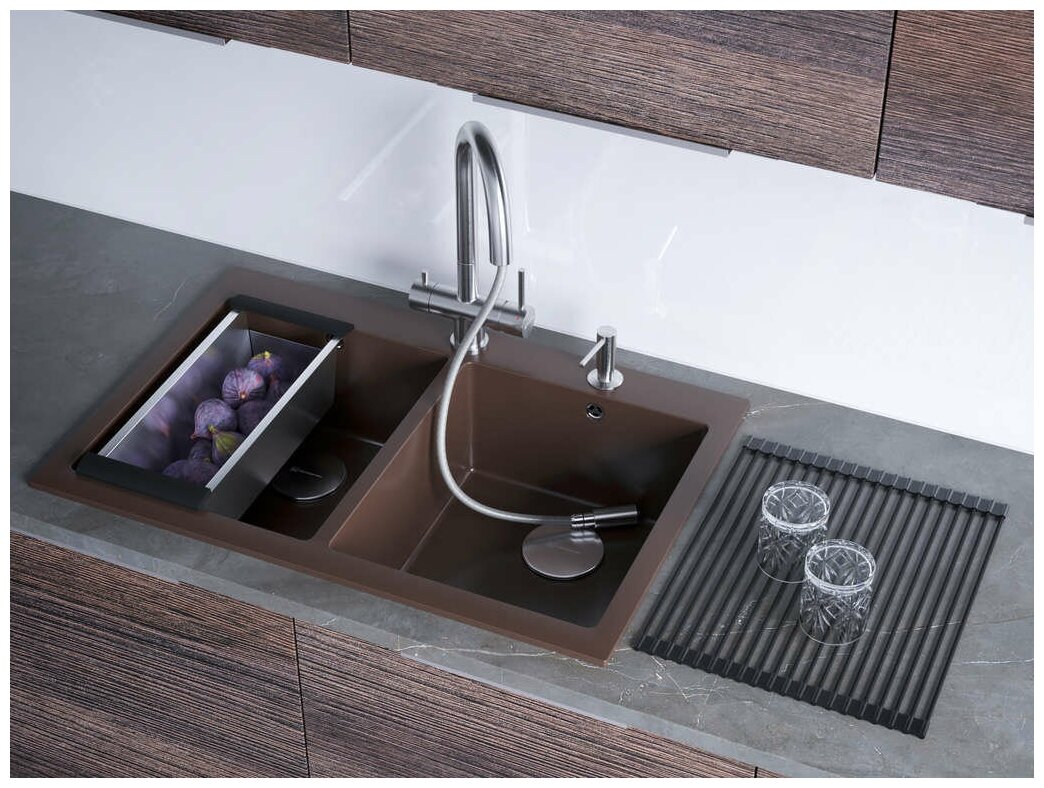 Лучшие цены. Мойка Omoikiri BOSEN 80-2 отливается из искусственного гранита TetoGranit. Модель предусматривает в себе две объемных чаши, что обеспечивает комфорт эксплуатации. Например, в одной можно замачивать посуду, а в другой споласкивать тарелки или продукты. На удобном уступе можно разместить смеситель, дозатор и другие полезные аксессуары. Материал поверхности устойчив к перепадам температур, образованию сколов и царапин, что гарантирует долговечность использования раковины. Магазины в вашем городе.