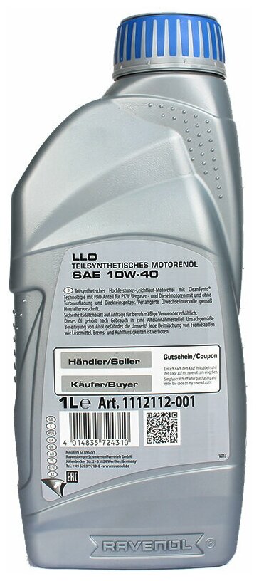 Лучшие цены. RAVENOL Leichtlaufoel LLO 10W-40 – полусинтетическое моторное масло высшего качества, изготовленное в Германии на основе высокоиндексного гидрокрекингового базового масла. Надёжно защищает двигатель при экстремально тяжёлых условиях эксплуатации, включая эксплуатацию автотранспорта в городском цикле «Старт- Стоп». Вязкостный интервал 10W40 позволяет применять полусинтетическое моторное масло RAVENOL Leichtlaufoel LLO 10W-40 круглогодично, включая холодную зиму. Магазины в вашем городе.