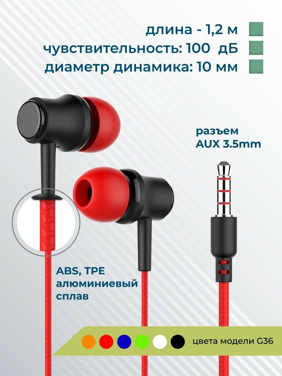 Наушники More choice вакуумные AUX разъём с МК без рег.громкости длина 1.2м красный G36
