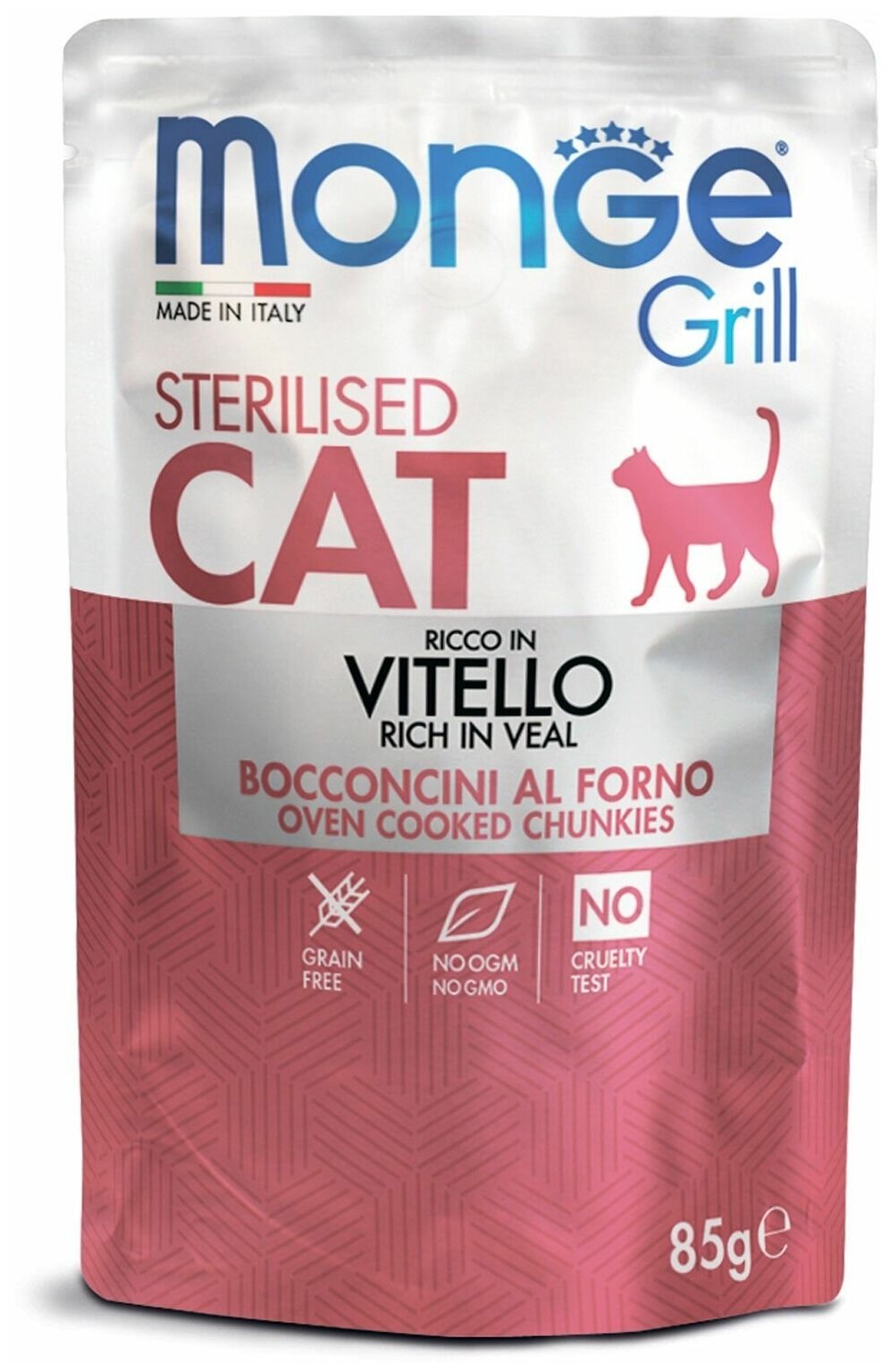 Влажный корм для стерилизованных кошек Monge Grill, беззерновой, с телятиной 12шт.×85 г (кусочки в соусе)