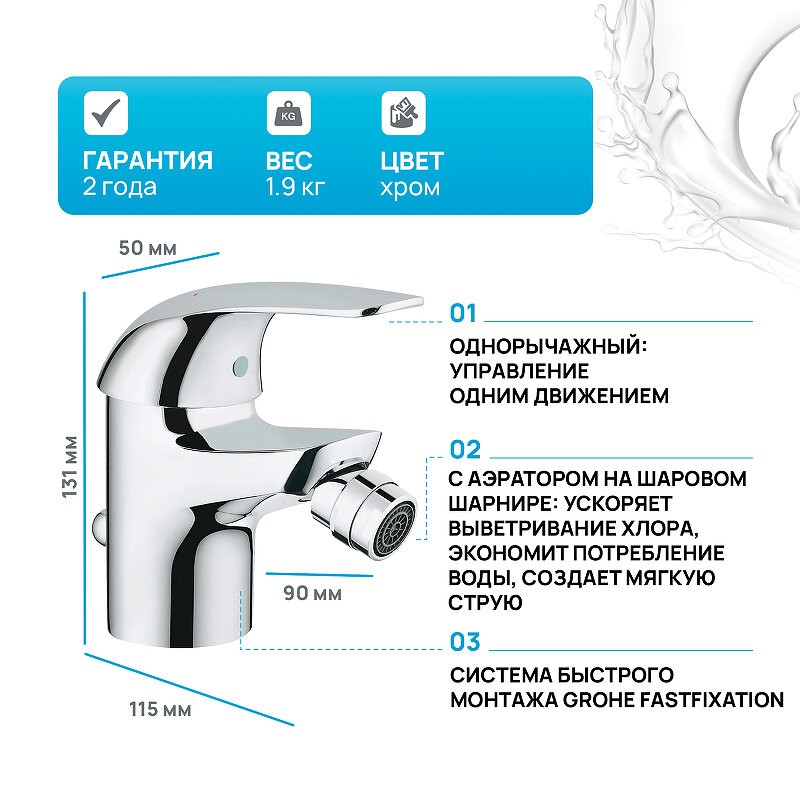 Смеситель для биде GROHE Euroeco с донным клапаном, хром (23263000)