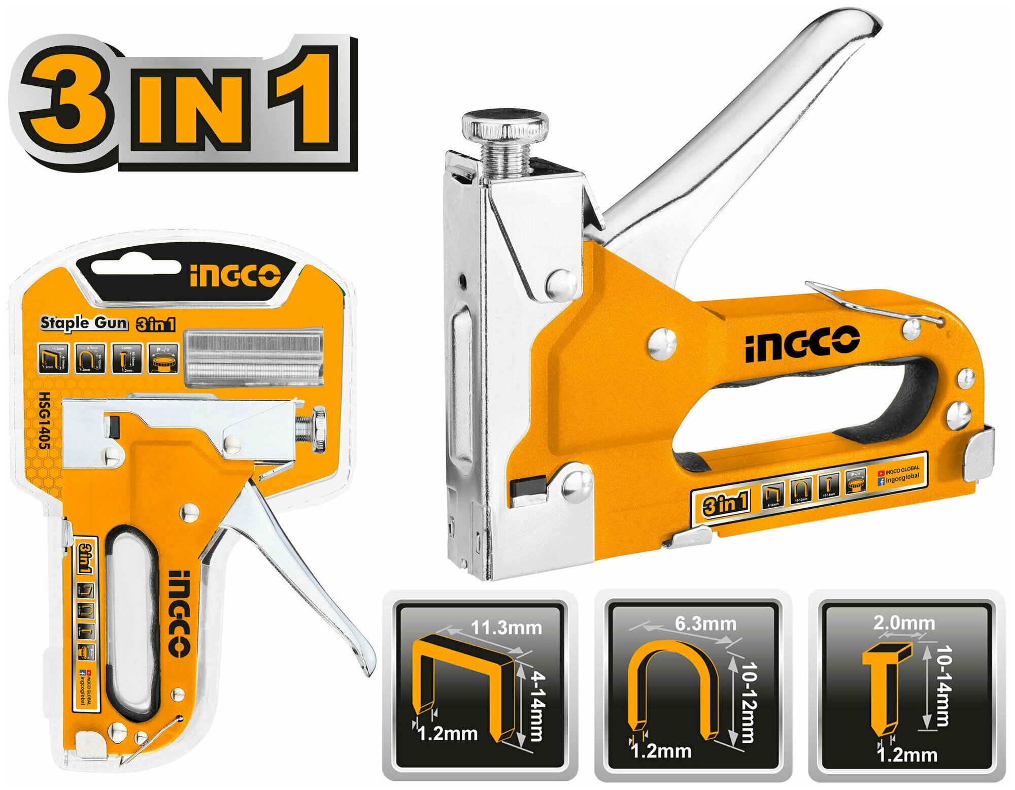 Пистолет скобозабивной металлический 3 в 1, скобы в комплекте, Ingco HSG1405