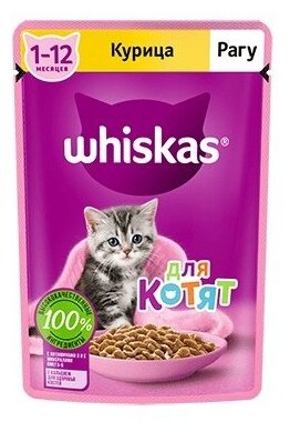 Лучшие цены. Рацион Whiskas® для котят "Рагу" — это сбалансированный рацион для здорового роста вашего малыша. Котенок с удовольствием попробует маленькие нежные кусочки с курицей в ароматном соусе. Все для замурррчательной жизни! Рационы Whiskas® для котят позаботятся об иммунитете, поддержат здоровое пищеварение и обеспечат здоровый рост и развитие. Котята активно растут и с первых дней нуждаются в правильном питании. Корм Whiskas® для котят создан с учетом всех особенностей развития организма котенка. Магазины в вашем городе.