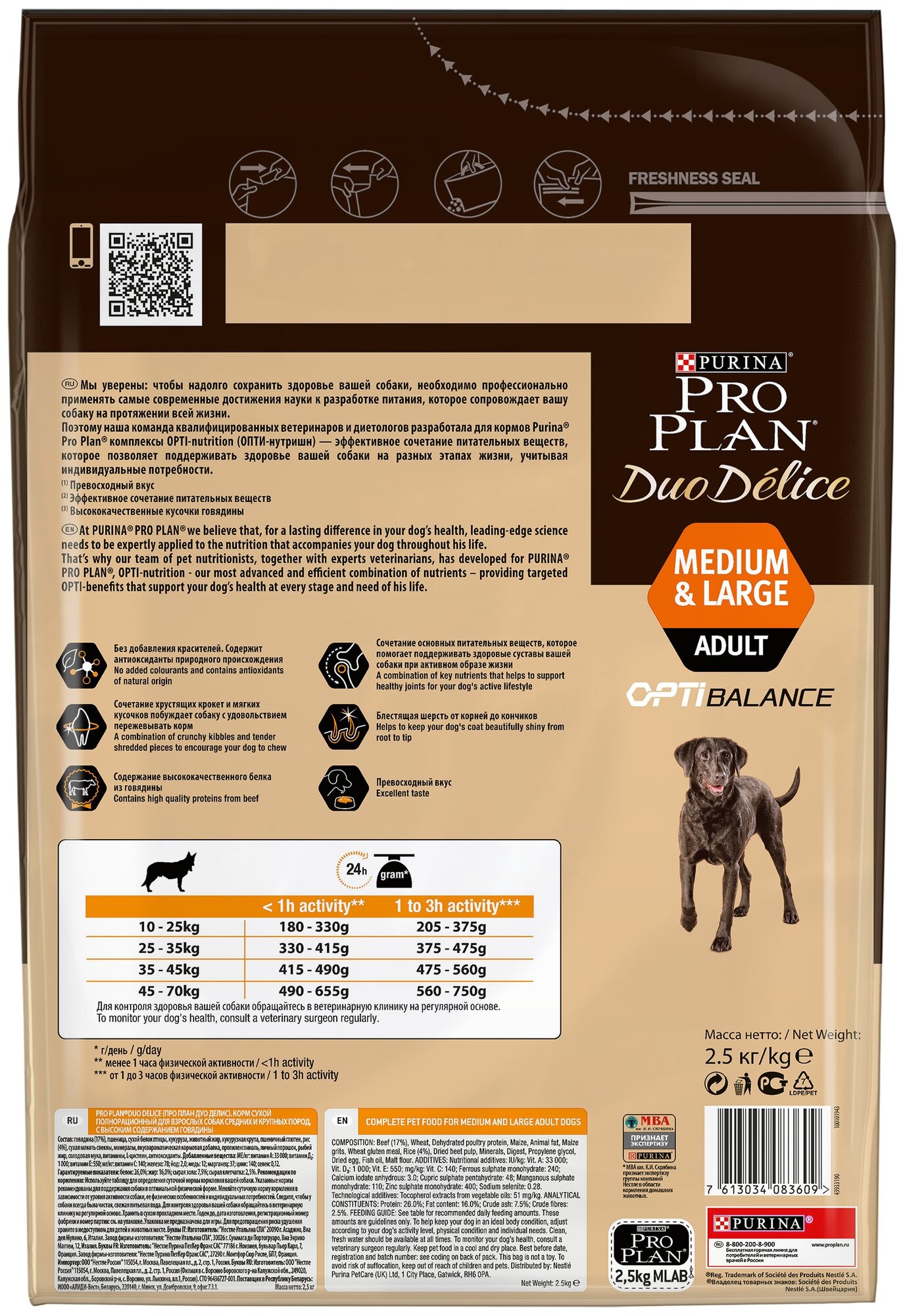 Корм для собак Сухой корм Pro Plan Duo Delice для взрослых собак средних и крупных пород, с высоким содержанием говядины, Пакет, 2,5 кг
