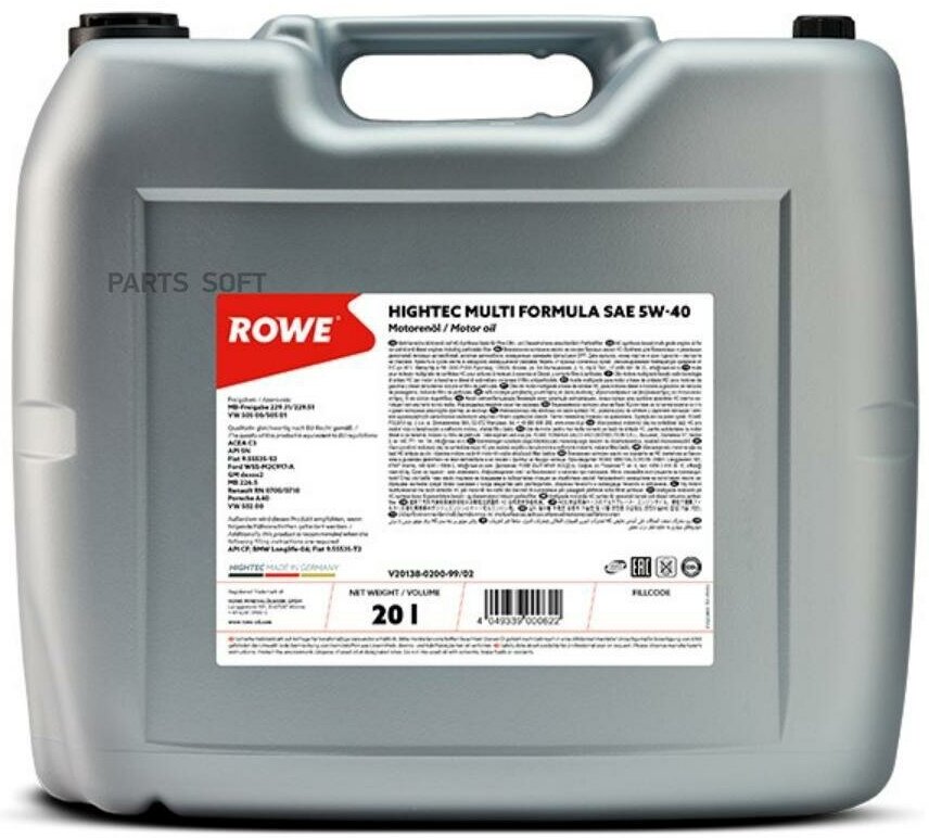 ROWE 20138020099 Масло моторное ROWE HIGHTEC MULTI FORMULA 5W-40 C3 (20л) SN,Fiat 9.55535-S2,Ford WSS-M2C917-A,GM dexos2 MB 226.5, Porsche A40, Renault RN 0700/0710API CF, BMW Longlife-04, Fiat 9.55535-T2 MB-Freigabe 229.31/229.51, VW 505 00/505 01