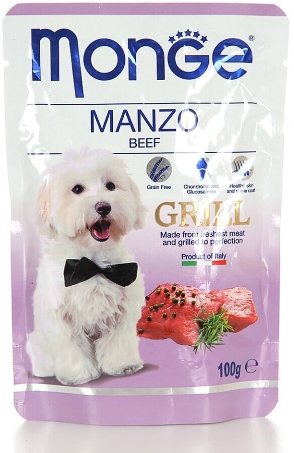 Лучшие цены. Monge (Монж/Монже) Dog Grill паучи для собак с говядиной. Полноценное сбалансированное питание для взрослых собак всех пород. Корм изготовлен из запеченного мяса говядины, не содержит злаков. Формула содержит глюкозамин и хондроитин для поддержания здоровья суставов. Питательная ценность: сырой белок 9%, сырая клетчатка 0,5%, сырой жир 5%, сырая зола 2.5%, влажность 80%. Пищевые добавки/кг: витамин D3 250 МЕ, витамин Е (альфа-токоферола ацетат) 8мг. Магазины в вашем городе.