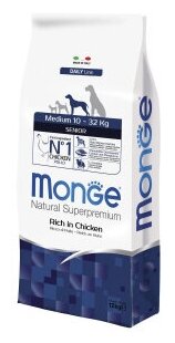 Лучшие цены. Monge (Монж) Dog Daily Line Medium сухой корм из мяса курицы для пожилых собак средних пород 12 кг. Полнорационный сбалансированный сухой корм из мяса курицы и рисом для собак. Предназначен для ежедневного кормления пожилых собак средних пород от 10 до 32 кг. Основой рациона является легкоусвояемое мясо курицы. Корм отлично усваивается и способствует правильному пищеварению. Пребиотики М. О. S и X. O. S. Магазины в вашем городе.
