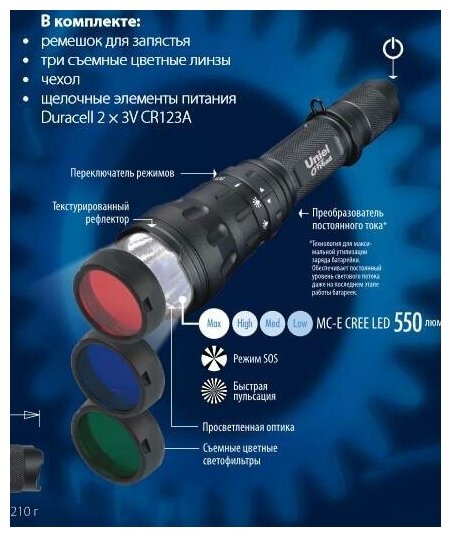 Фонарик Типы/Уличное освещение/Фонарики Uniel Ручной светодиодный фонарь Uniel от батареек 162х44 550 лм P-ML076-BB Black 05727