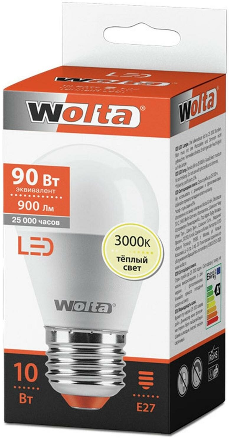 Лучшие цены. Wolta E27 10 Вт - компактная светодиодная лампа с теплым белым свечением. Преимущества Шарообразный рассеиватель хорошо смотрится в бра, торшерах, люстрах с небольшими или полуоткрытыми плафонами. Матированная колба создает мягкий, приятный для глаз световой поток. Диоды экономичны, тратят на 90 процентов меньше энергии, чем традиционные лампы накаливания. Область применения Светодиодная лампа используется для освещения жилых помещений. Подходит для светильников с цоколем Е27. Магазины в вашем городе.