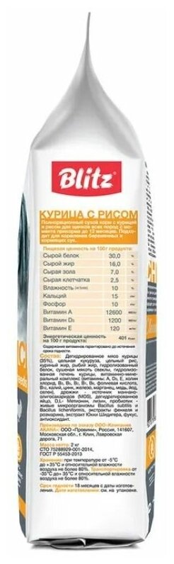 Лучшие цены. Полнорационный сухой корм для щенков Blitz Puppy Chicken можно назвать универсальным: он рассчитан на малышей и юниоров всех пород и размеров (до 12 мес.). Прикорм щенков можно начинать с 3-4 недель, предварительно размочив корм тёплой водой за 30 минут до кормления. С 1,5 месяцев рекомендуем полный переход на корм. Питательный рацион на основе мяса цыплёнка обеспечит любимца всеми необходимыми элементами, столь необходимыми для роста, игр и полноценного взросления. Магазины в вашем городе.