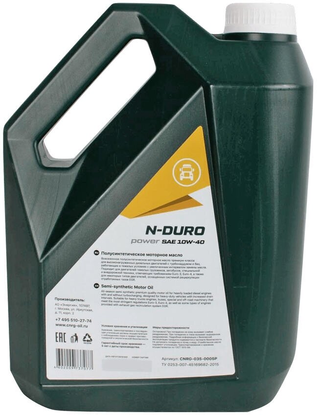 Лучшие цены. CNRG N-Duro Power 10W40 5л Всесезонное полусинтетическое моторное масло премиум-класса для высоконагруженных дизельных двигателей с турбонаддувом и без, работающих в тяжелых условиях с увеличенным интервалом замены масла. Подходит для двигателей тяжелых грузовиков, автобусов, специальной и внедорожной техники, отвечающих требованиям Euro-3, Euro-4, а также для некоторых типов двигателей, оснащенных системой рециркуляции отработанных газов EGR. Магазины в вашем городе.