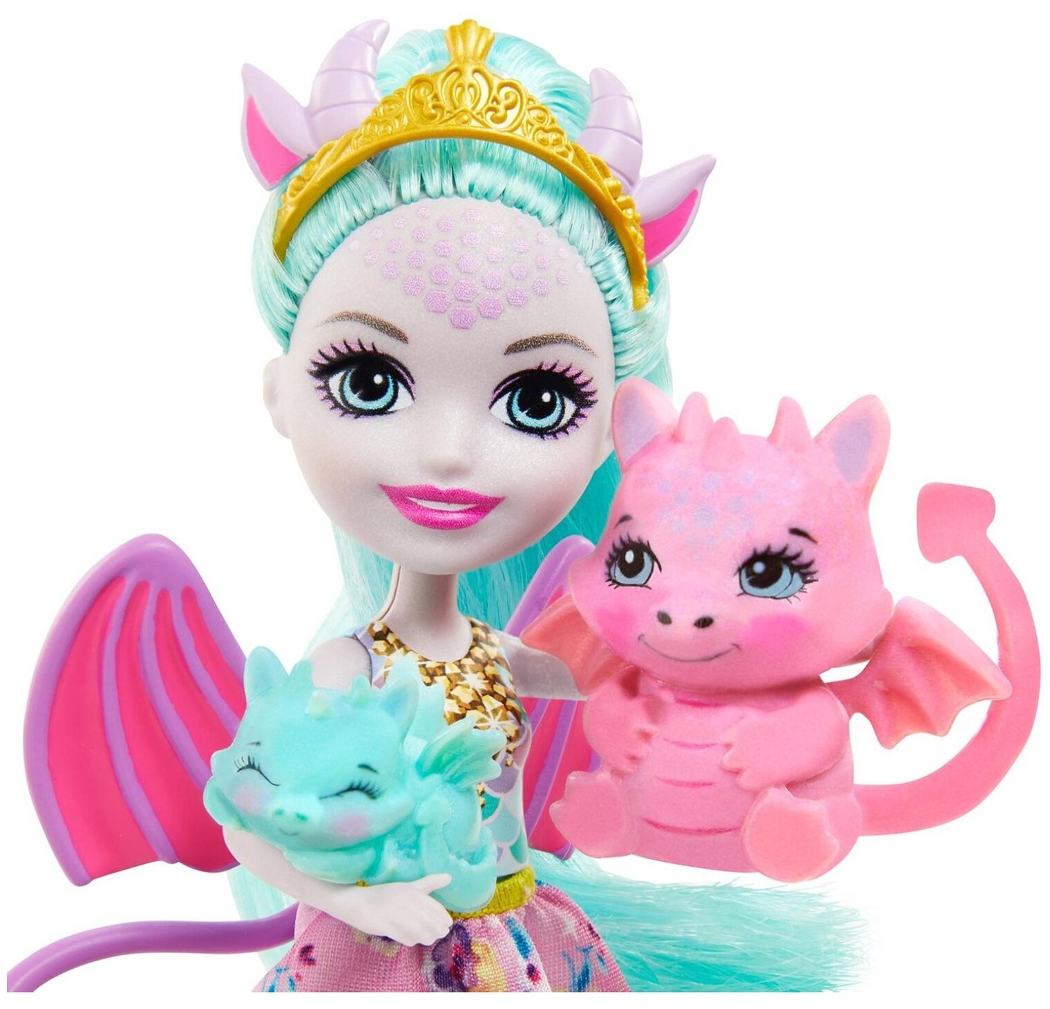 Лучшие цены. Диана Дракон и ее большая семья живут в мире Enchantimals – волшебном месте, скрытом в лесах. Кукла Диана одета в сиреневую съемную юбку и желтые туфельки, а ее голову украшает изящная корона. Рожки, драконьи крылья и хвост показывают ее особую связь с драконьим семейством. Кукла обожает проводить время с очаровательными друзьями-дракончиками. Эта троица может сопровождать Диану на королевский бал, ведь у них есть приглашение и приготовлен подарок. Магазины в вашем городе.