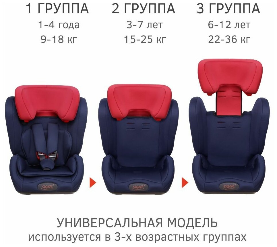 Лучшие цены. Автокресло Siger «Гранд Isofix» разработано для детей от 1 года до 12 лет, весом от 9 кг до 36 кг. Относится к возрастной группе 1/2/3. Кресло трансформируется под три возрастные группы: от 1 года до 3-4 лет (полная комплектация), от 3 до 6-7 лет (снимаются ремни и внутренние накладки), от 7 до 12 лет (фиксация подголовника в крайнем верхнем положении). Перфорированная ткань в области спины не допускает перегрева и обеспечивает вентиляцию. Магазины в вашем городе.