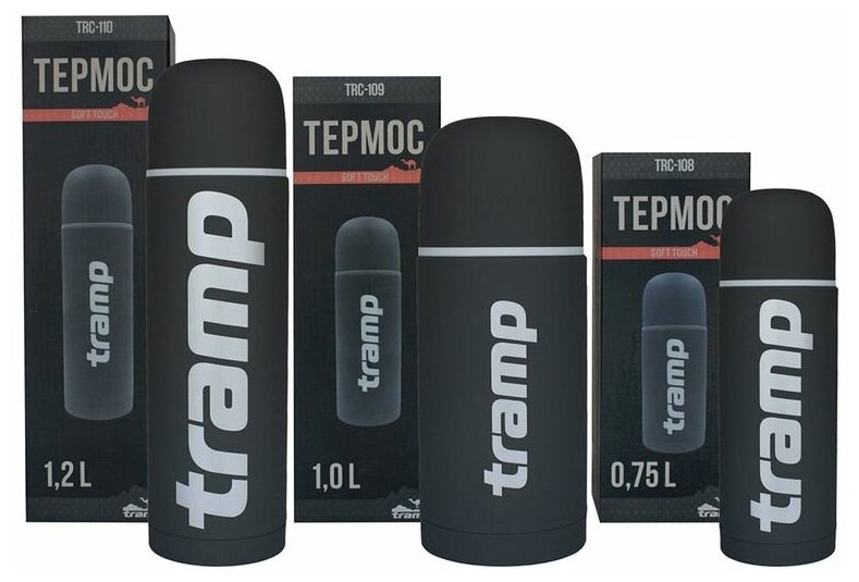 Лучшие цены. Классическая серия термосов для города Tramp Soft Touch 1,2 л. Резиновое нескользящее покрытие — термос удобно держать в перчатках, не холодит руки на морозе. Матовое покрытие выглядит очень красиво. Характеристики: * Глухая пробка с каналами для налива в полузакрытом состоянии — дольше сохраняется тепло * Горло шире, чем у стандартных термосов для напитков — удобно мыть и доставать остатки фруктов или трав * В комплект входит дополнительная пластиковая пиала * Сохранение тепла 80° 6 часов 70° 12 часов 56. Магазины в вашем городе.