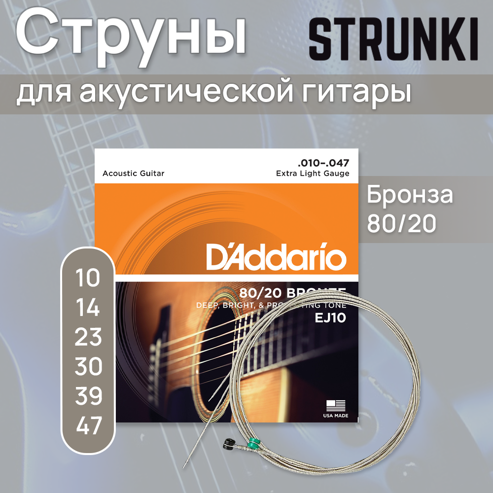 Струны D`Addario EJ10 BRONZE 80/20 10-47 бронза для акустической гитары 720 ₽ Подробнее