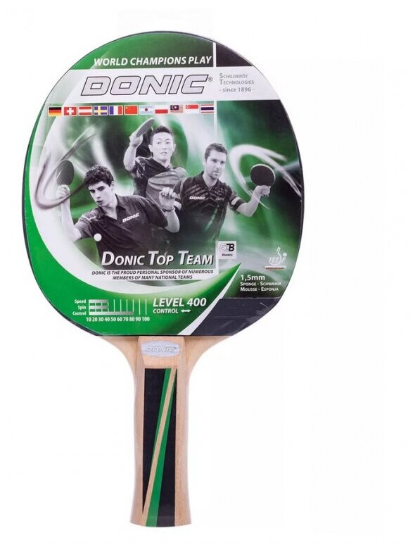 Лучшие цены. Ракетка для настольного тенниса Top Team 400 от всемирно известного немецкого бренда Donic-Schildkröt прекрасно подходит начинающим игрокам, которым требуется овладеть базовой техникой игры и игрой в обороне. Характеристики ракетки для пинг-понга позволят эффективно гасить скорость входящих ударов, точно возвращать мяч по направлению, контролировать траекторию движения мяча и дальности полета, изматывая соперника невольными перемещениями у стола и увеличивая шанс на его невынужденные ошибки. Магазины в вашем городе.