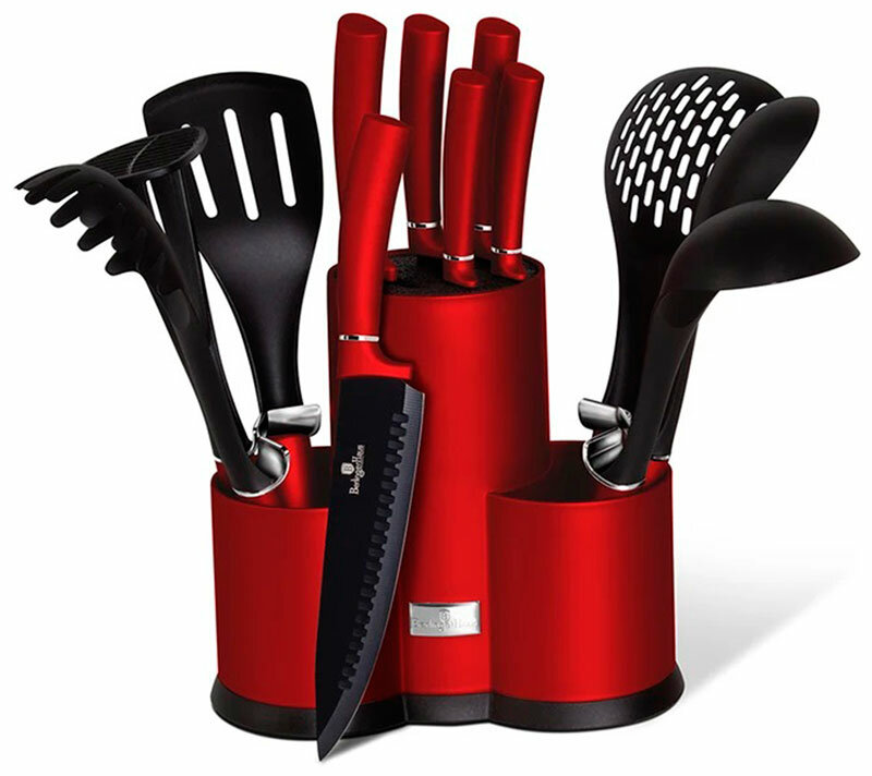Лучшие цены. Набор ножей и кухонных аксессуаров на подставке BerlingerHaus 6248-BH идеально подходит для мраморных, керамических и антипригарных поверхностей. Практичная подставка под все приборы. Вы можете ставить приборы на неё, не пачкая столешницу или плиту. Нейлон удобен для вашей посуды, он никогда не поцарапает её. У всех инструментов есть проушина, для того, что бы их можно было повесить на крючок. Дизайн отлично впишется в любую кухню, даже самую современную, не содержит вредных веществ. Магазины в вашем городе.