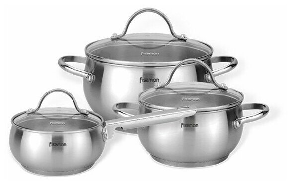 15829 FISSMAN Набор посуды MARTINEZ 6 пр.(нерж. сталь) Ковш 14х7см - 1,1л; Кастрюля 16х9см - 1,8л; Кастрюля 20х11см - 3,45л нерж.сталь; Крышки стекло; Индукция; Термоаккумулирующее многослойное дно. Снаружи зеркальный.