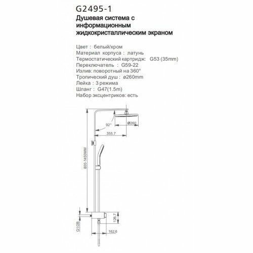 | Комплектация | ручной душ (душевая лейка) / верхний душ (тропический) / смеситель / стойка / штанга / душевой шланг / крепление ручного душа |