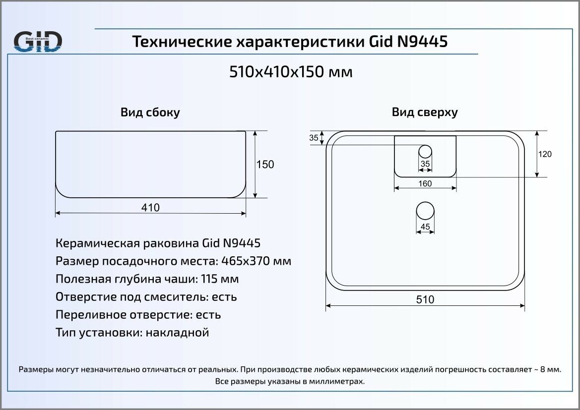 Умывальник Накладная раковина 51x40x15 см, Gid, N9445