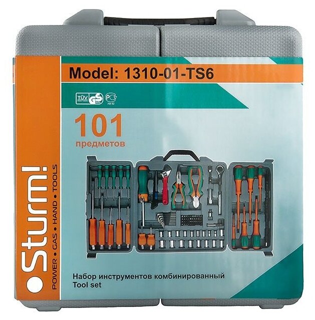 Лучшие цены. Набор инструментов STURM 1310-01-TS6 - это совокупность различных ручных инструментов в одном кейсе. В наборе подобран необходимый ручной инструмент для ремонтных работ в доме и в мастерской. В комплект входят инструменты для крепежа, монтирования, плоскогубцы для работ с электропроводкой и другие инструменты. Общие характеристки Тип: универсальный Количество предметов в наборе: 101 шт Отвертки Набор отверток в комплекте: есть, 18 шт Отвертки плоские: есть Отвертки крестовые: есть Отвертки крестовые. Магазины в вашем городе.