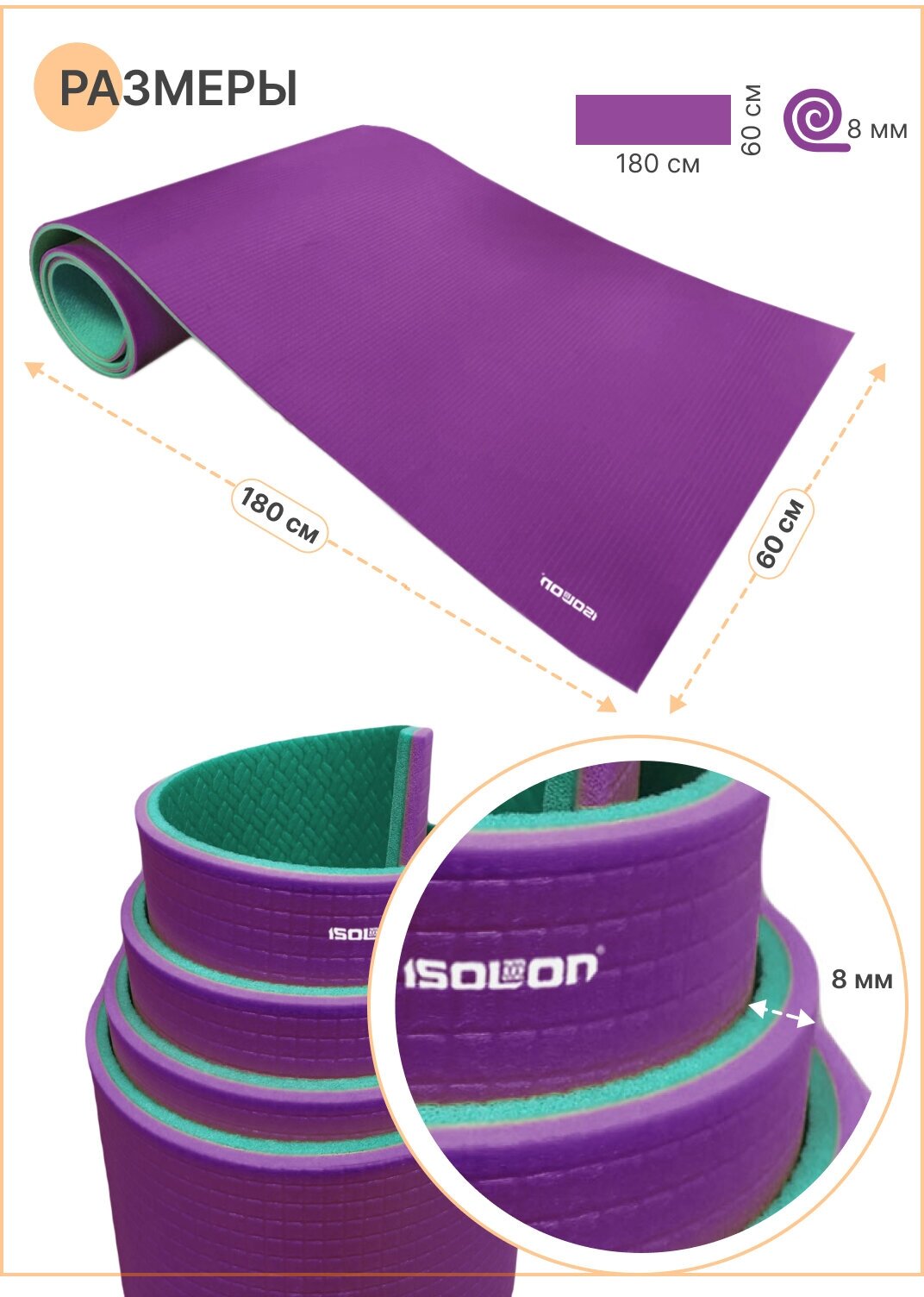 Туристические коврики Коврик для туризма и отдыха классический Isolon Tourist 8 мм, 180х60 см бирюзовый/фиолетовый