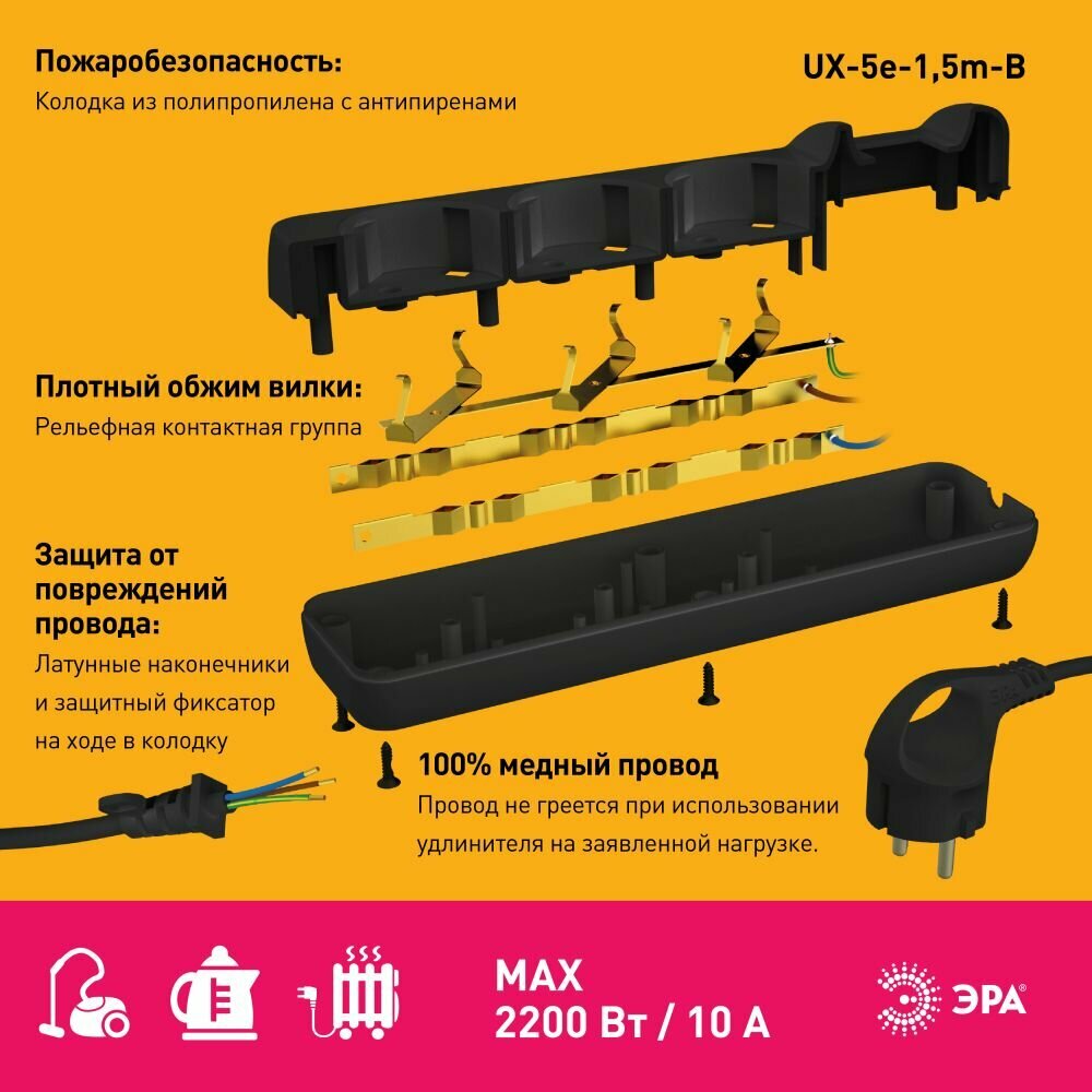 Удлинитель электрический UX-5e-1.5m-B с заземлением 5 розеток 1.5м ПВС 3х0.75кв.мм 10А черн. | код. Б0057724 | Эра ( 1шт. )
