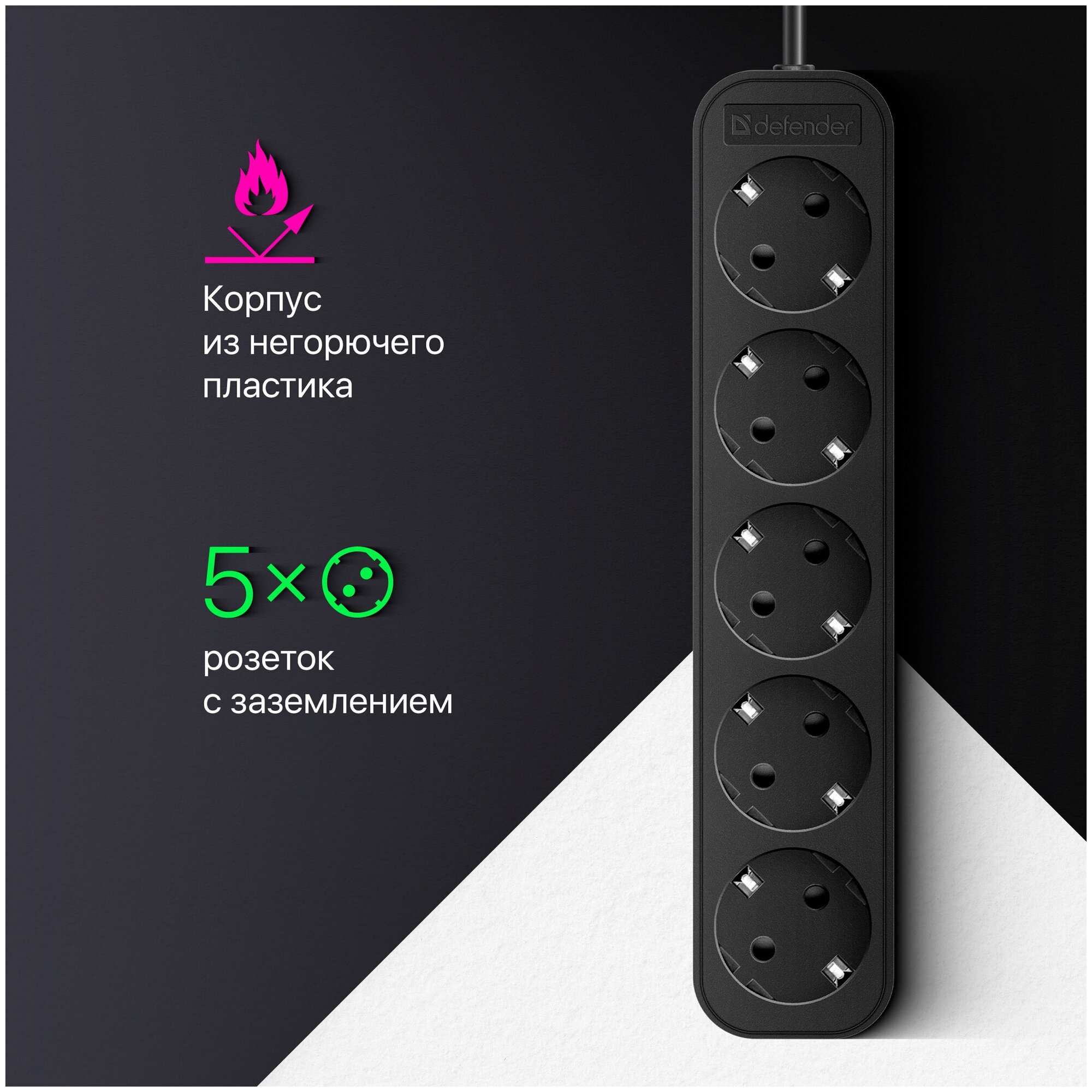Сетевые фильтры и удлинители Удлинитель с заземлением Defender M530 3.0 м, 5 розеток, черный